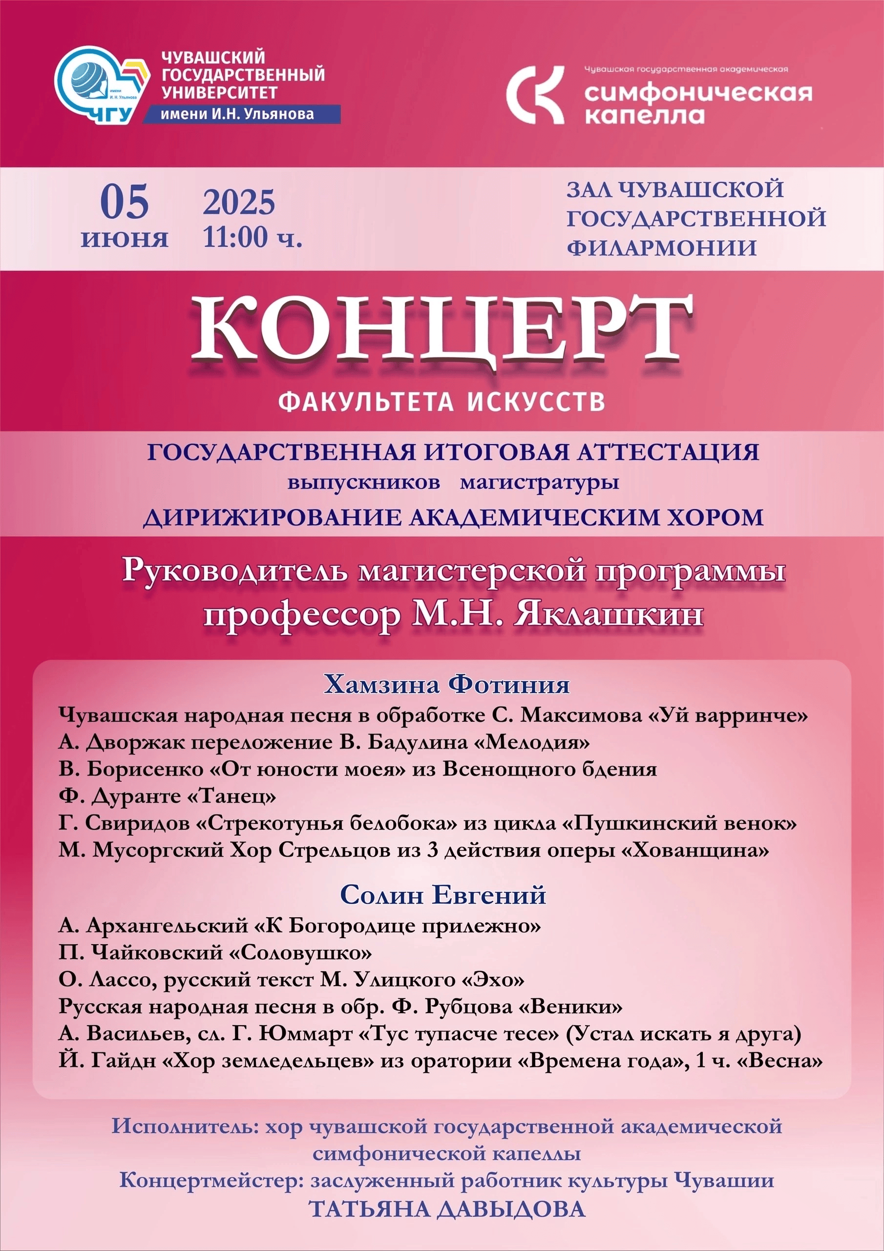 Государственная итоговая аттестация состоится 05 июня в 11:00 в зале Чувашской государственной филармонии (Президентский бульвар, 9).