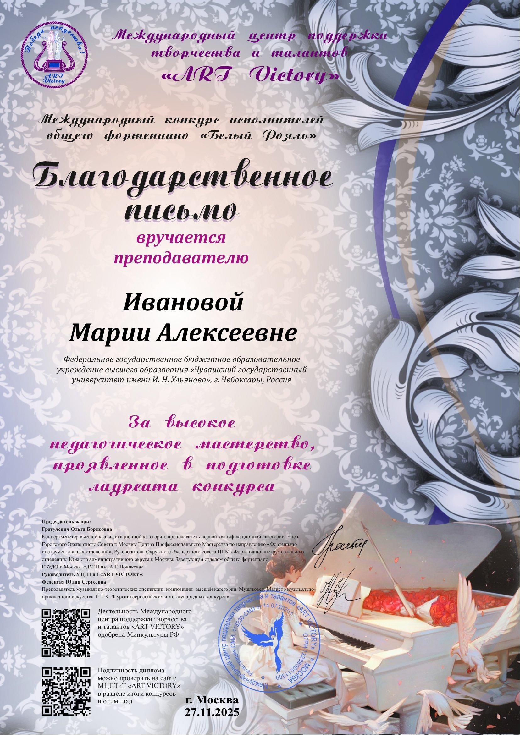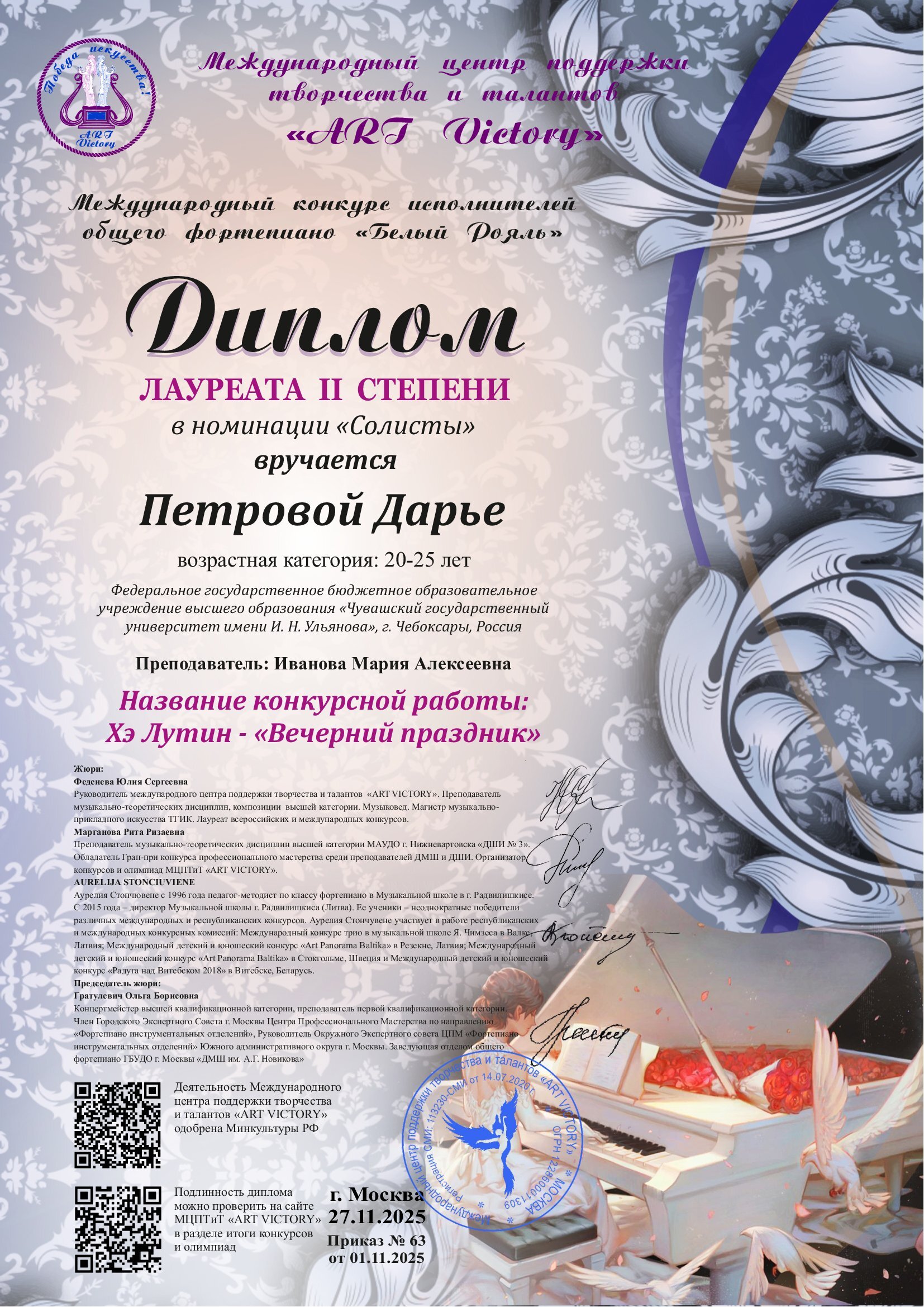 Наши поздравления Петровой Дарье, ставшей лауреатом ll степени международного конкурса по фортепиано г. Москва.
