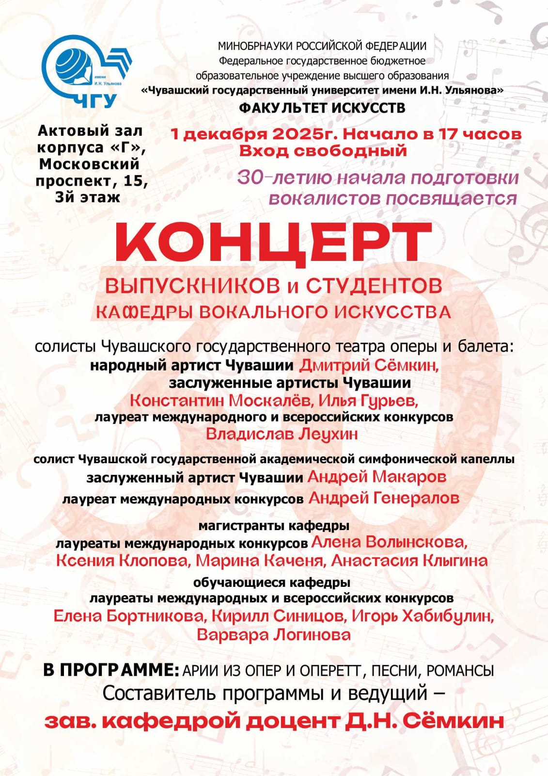 1 декабря 2025г в 17.00 в Актовом зале корп.Г состоится Концерт выпускников и студентов кафедры вокального искусства, посвященный 30-летию начала подготовки вокалистов
