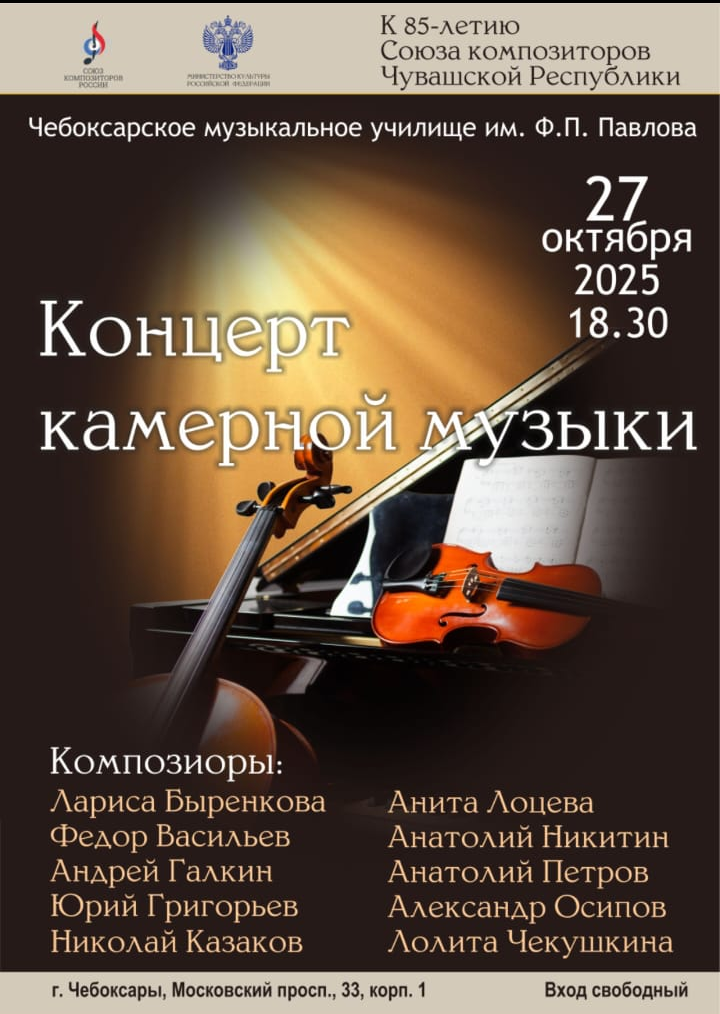 К 85-летию Союза композиторов ЧР Концерт камерной музыки с участием Заслуженного работника культуры ЧР, доцента Саприко М.С. и Народного артиста ЧР, доцента Семкина Д.Н. в 18.30ч. Чебоксарское музыкальное училище им. Ф.П. Павлова