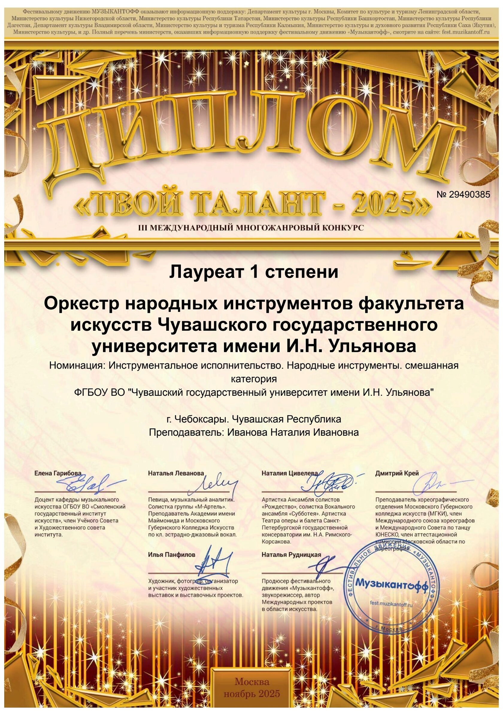 Поздравляем участников оркестра народных инструментов ЧГУ им. И.Н. Ульянова под руководством Наталии Ивановны Ивановой с победой в номинации "Инструментальное исполнительство"